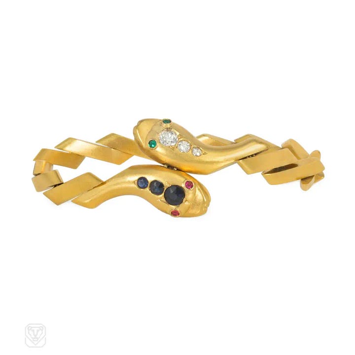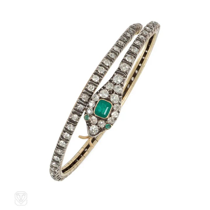 6. I am deathly afraid of snakes, but I adore them as jewelry. They remind me of my dear friend, the late, great burlesque queen Zorita, who famously did a striptease with two eight foot long boa constrictors, Oscar & Elmer, called ‘The Consummation of the Wedding of the Snakes.” In her honor, I’d love any of the below snake bracelets from my favorite antique jewelry company, Kentshire. See, I’m not picky Santa, I’m giving you choices!