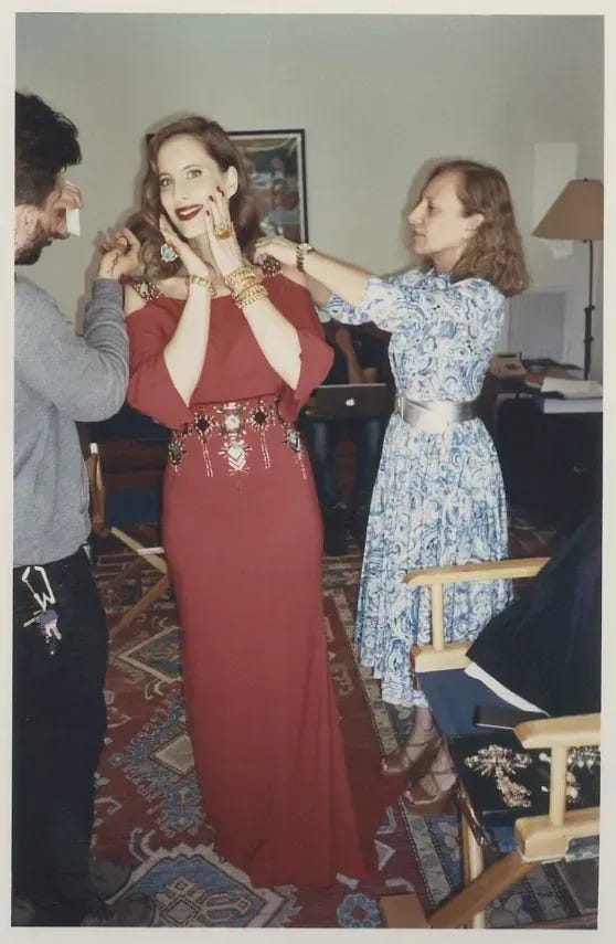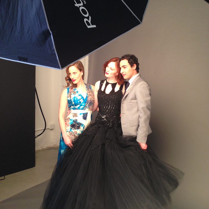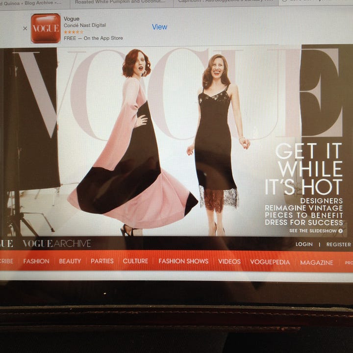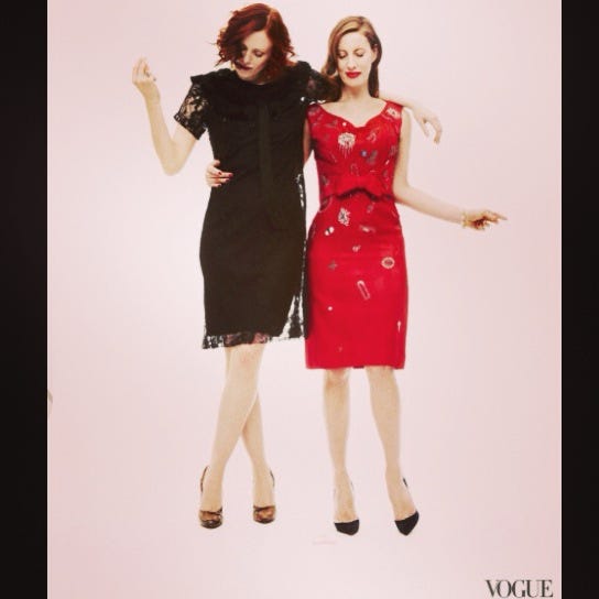 . Karen has been modeling since she was a teenager and has many stories to tell. Hopefully she will spill some of them on her new Substack, The Lipstick Letters. The Vogue shoot we did was tied to our charity sale, “Vintage Vanguard,” benefitting Dress for Success. I was not pleased with resembling an AI alien from Planet Hollywood, especially given the context of the sale—helping homeless women and survivors of domestic violence feel good about themselves and get back into the workforce. Maybe they were trying to make me look more like a supermodel next to Karen, but I would topple over if my calves and ankles were that frail.